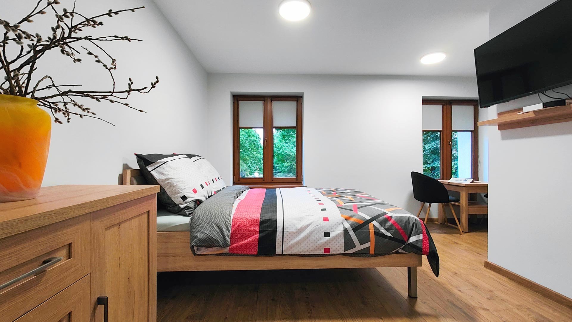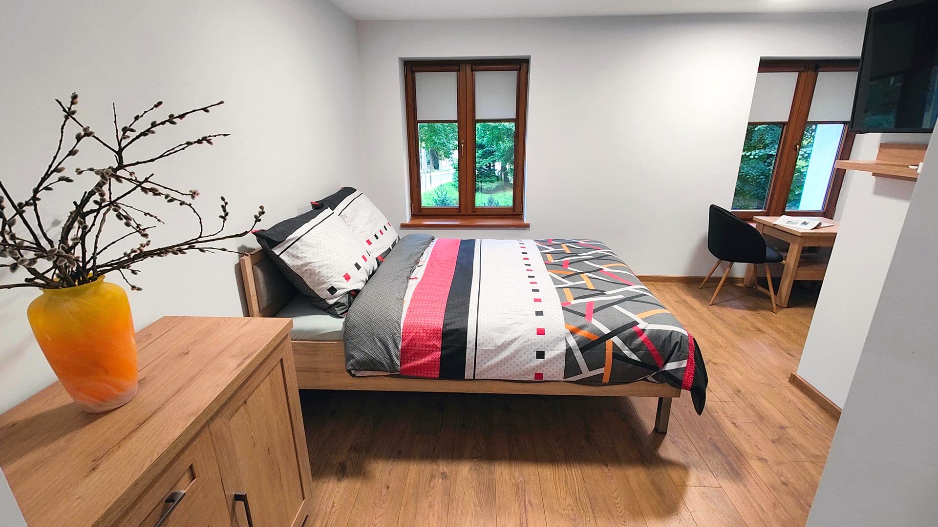 Zapewniamy bezpieczny parking, schowek na rowery oraz komfortowe i bezpieczne pokoje
